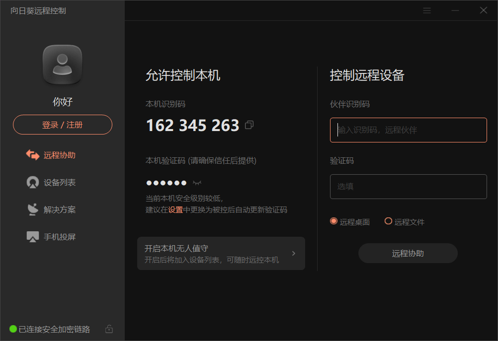 向日葵远程控制是一款可以对远程电脑进行管理和控制的服务软件。用户可免费使用远程控制、文件传输功能,向日葵远程控制可实现对远程主机进行远程管理、远程文件、远程摄像头、远程重启关机等操作。